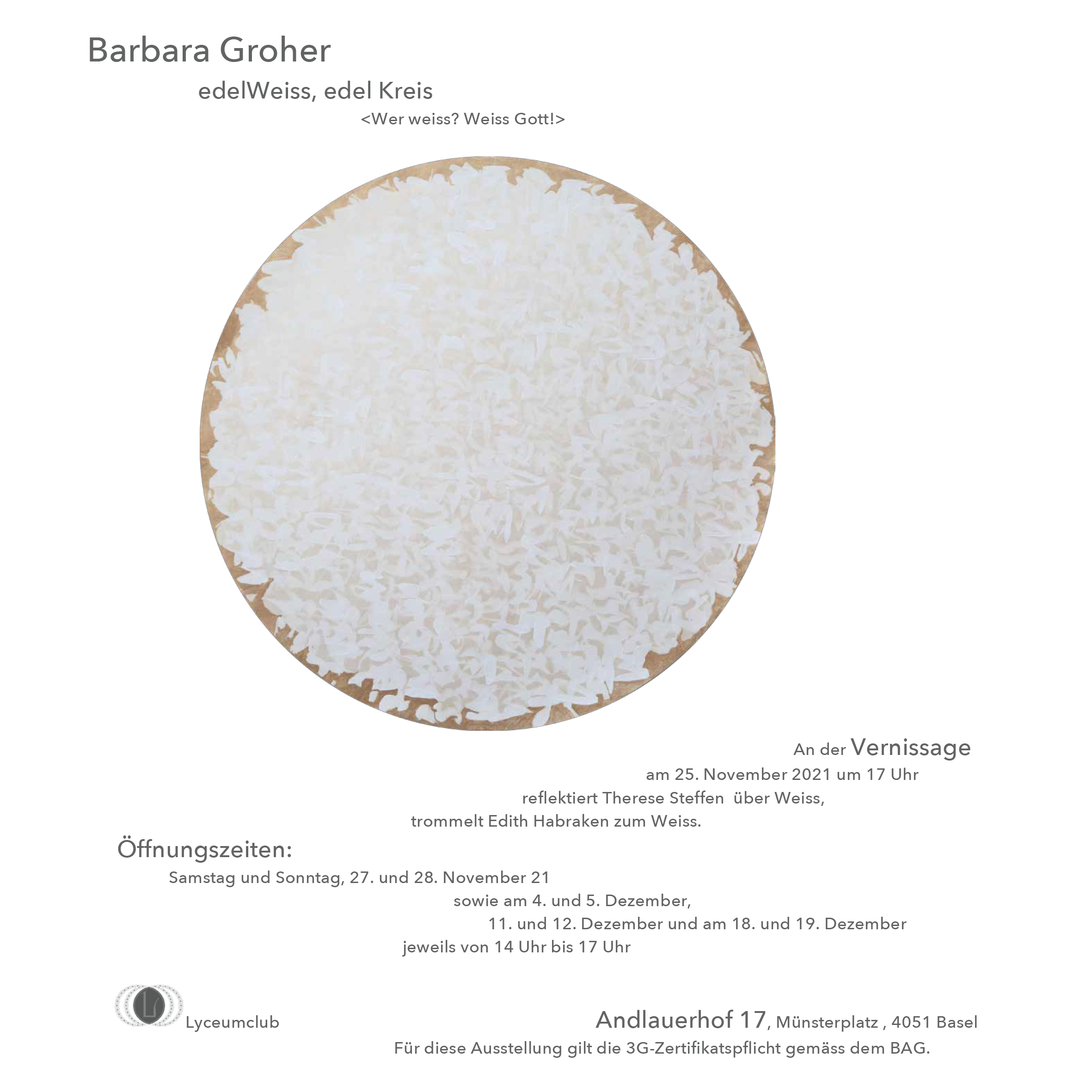 Barbara Groher wurde 1941 in Leipzig geboren, war von 1961 bis 1965 Galeriesekretärin bei Alfred Schmela in Düsseldorf. Ausgestellt wurde dort zu ihrer Zeit von Christo bis Beuys: «Ich lernte sehen», so sagt sie. Ab 1966 war sie als Texterin u. a. bei Doyle Dane Bernbach, Düsseldorf und später bei John Schmid in Arlesheim tätig: «Ich lernte schreiben», berichtet sie weiter. 1968 heiratete sie Rolf Preisig, 1970 und 1973 wurden die Töchter Anna und Mira in Düsseldorf geboren. Dann folgte der Umzug nach Basel und die Eröffnung der Galerie Rolf Preisig. Zwischen Kindern, Kunst und Werbung entstanden Lyrik und Romane. Das erste Poesiebüchlein trägt den Titel Ein Baum ist eine Wurzel ist ein Baum, 1982; der zweite Roman heißt Das Gegenteil von kaputt, 1990. Mit 68 begann sie, Verbales und Visuelles zu verbinden: Buch, Kunst, Buchkunst.